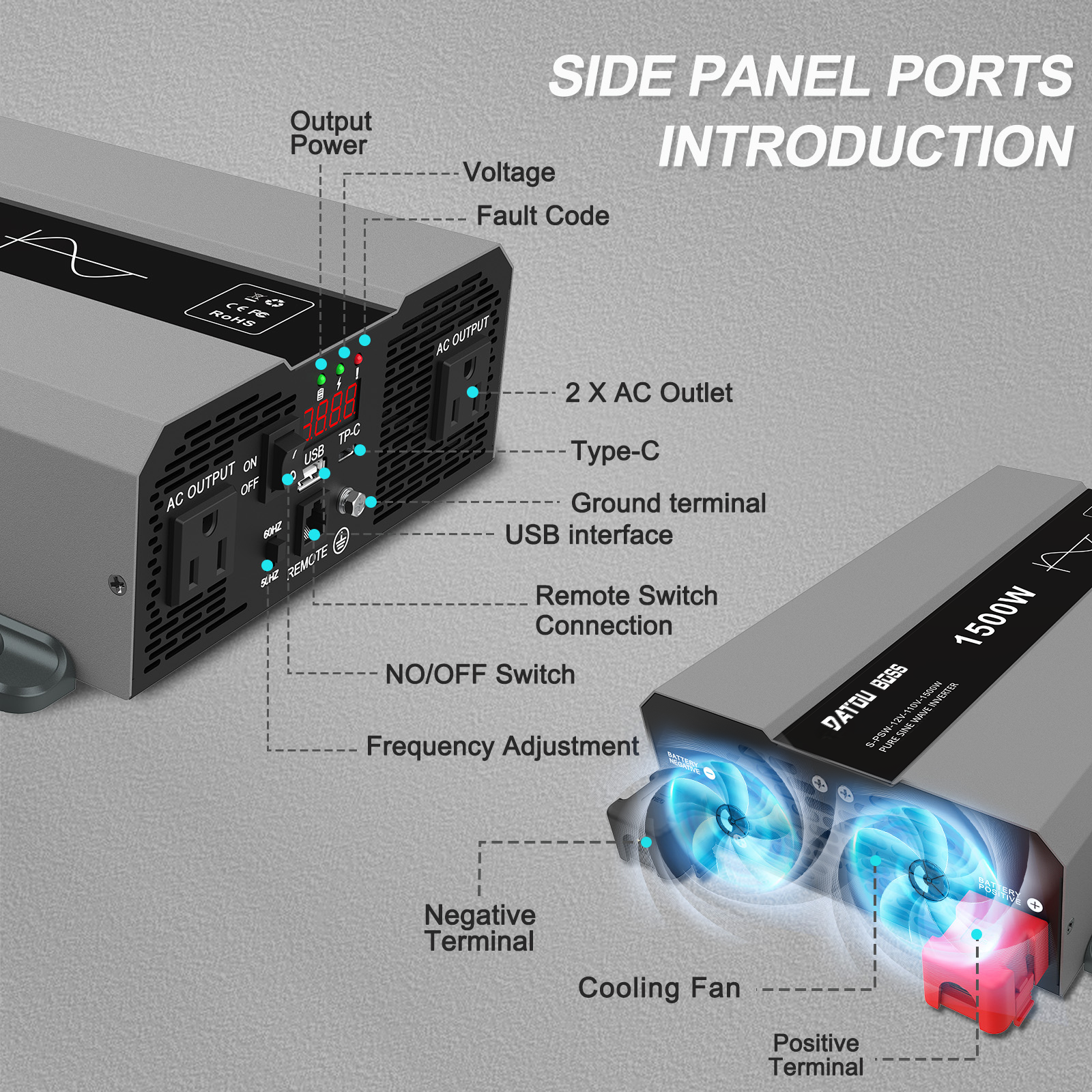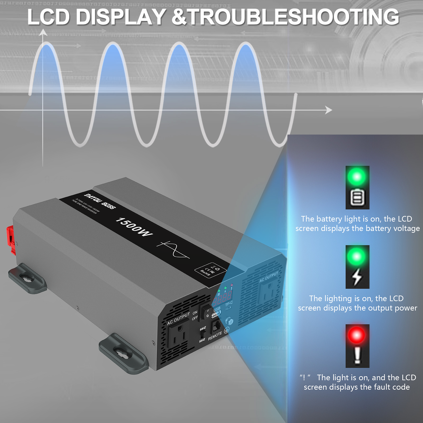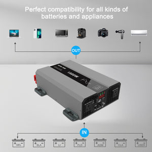 DATOUBOSS Pure Sine Wave Inverter 1500W Power 12V DC to 110V 120V AC Converter 3000W Peak Power Inverter with Dual AC Outlets USB Port Type-C Remote Control LCD Display for Truck RV Vehicles Solar