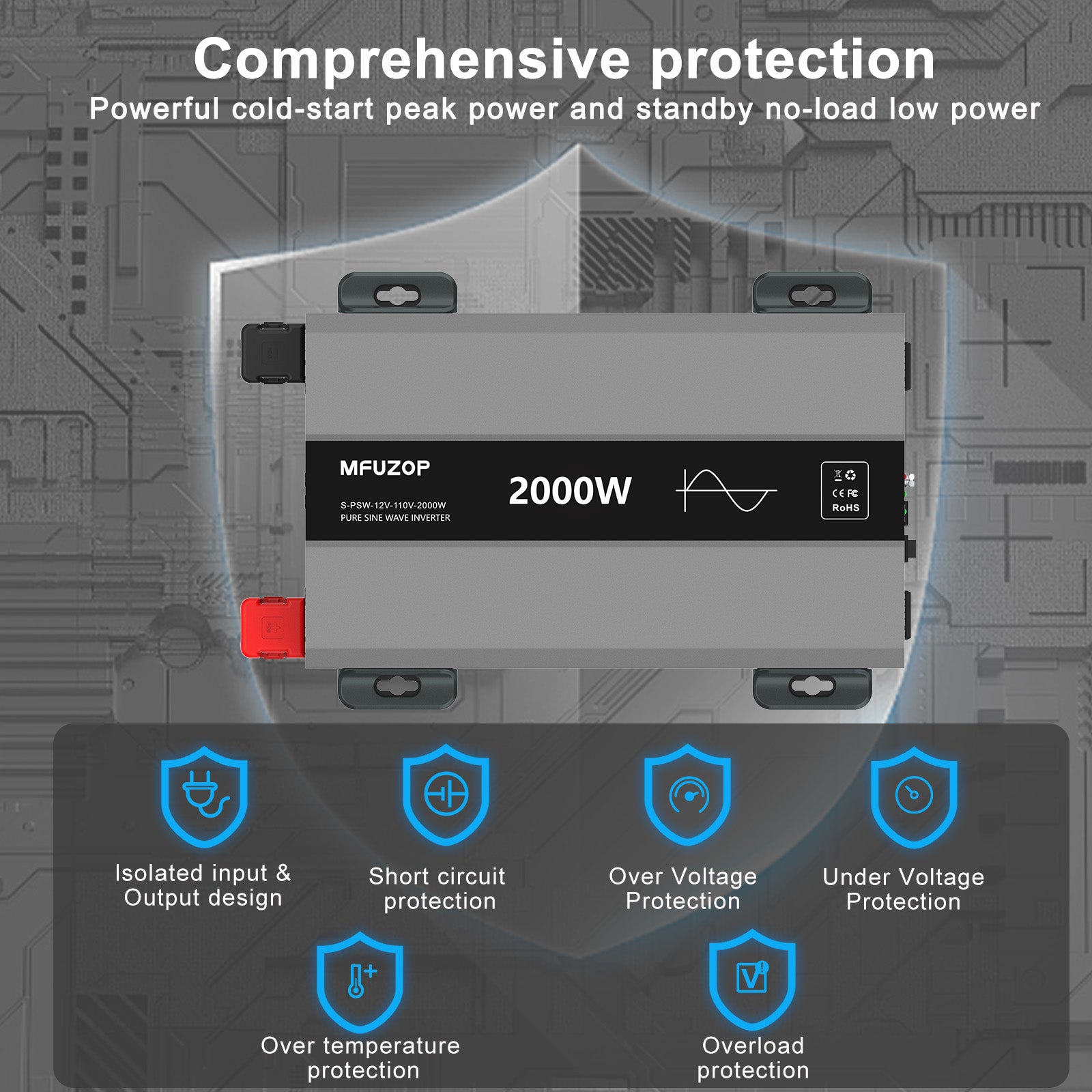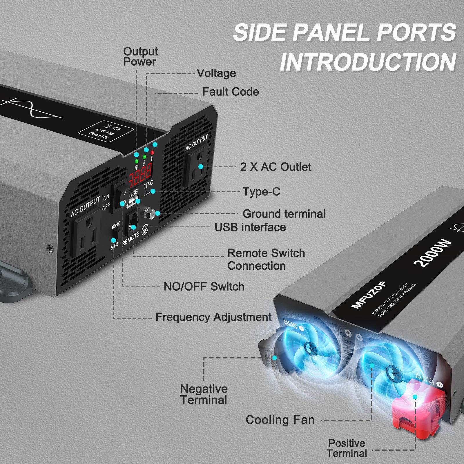 DATOUBOSS 2000W Pure Sine Wave Inverter, Car Power Inverter 12V to 110v 120V AC Converter for RV, Truck, Solar, OutdoorL, Home with Dual AC and 20A Socket, 5V 2.1A USB, PD, Peak Surge 4000W, Remote Controller
